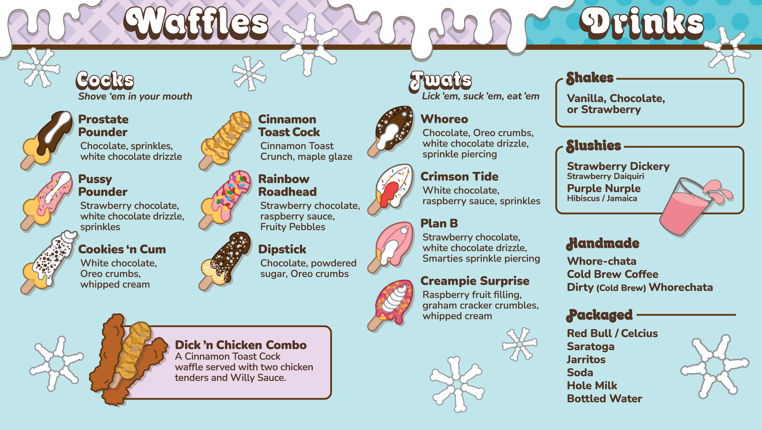 - Prostate Pounder* – chocolate-dipped waffle pop, rainbow sprinkles, white-chocolate drizzle
